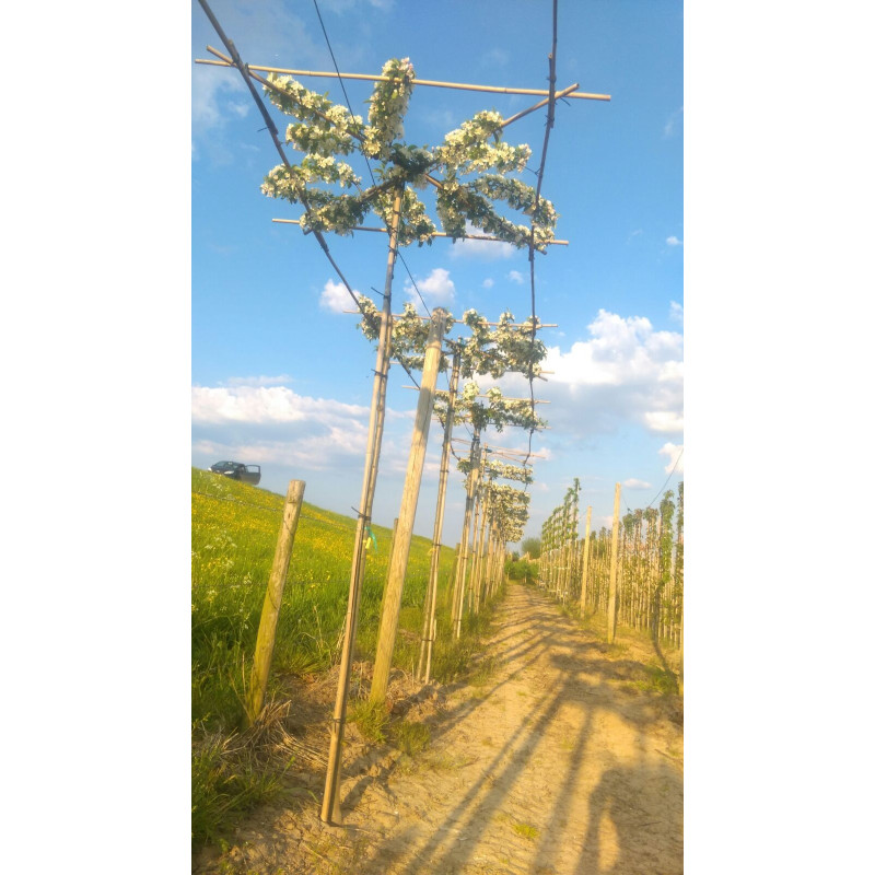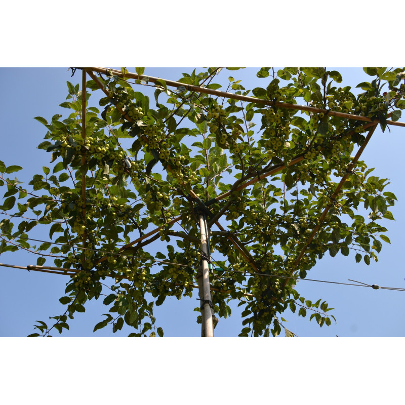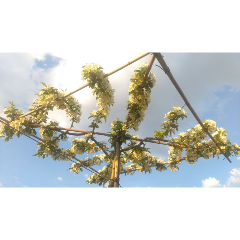 De Malus red Sentinel is een sierappel. Aan deze boom komt in het voorjaar mooie lichtroze bloesem, waarna er kleine rode sierappels aan groeien. Als meerjarig voorgeleide dakboom heeft de Malus red Sentinel al een aantal jaren als dakboom geleid op onze boomkwekerij gestaan. Dit betekent dat de takken in het dak al wat dikker en steviger zijn. Het dak is hierdoor ook al mooi vol. Het dak van deze bomen begint op 2,5m hoogte. Verder is het dak 150x150cm.