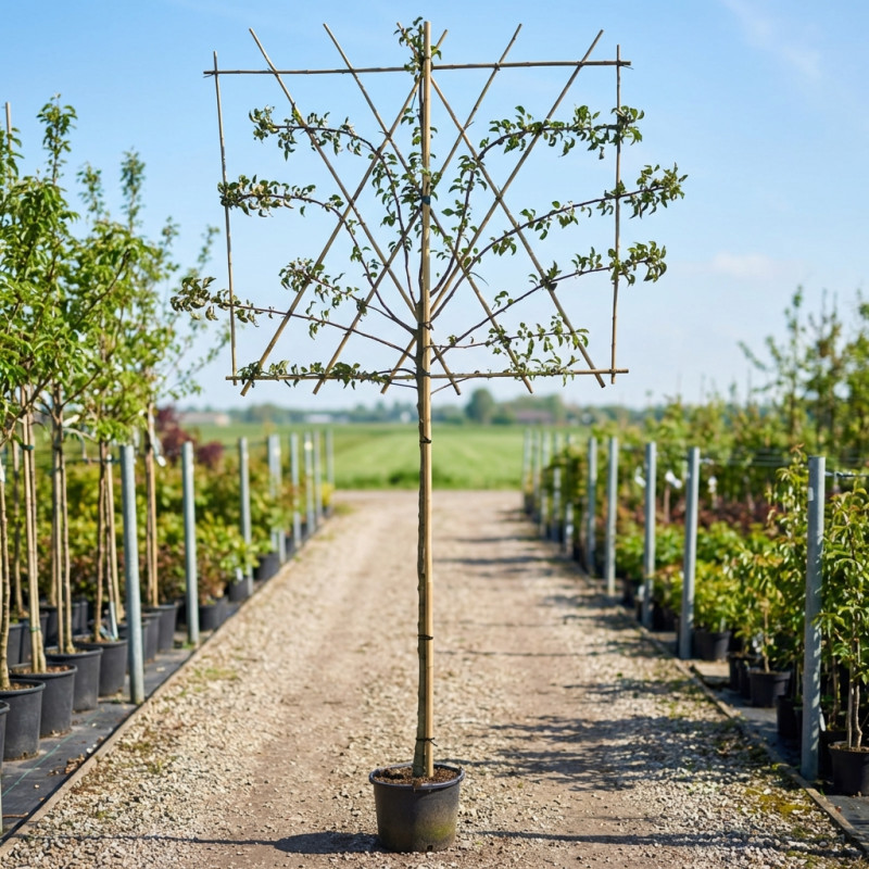 • Onderhoudssnoei: Snoei de boom jaarlijks, bij voorkeur in de winter als de boom in rust is. Verwijder dode, beschadigde of kruisende takken en zorg ervoor dat de leidende takken horizontaal blijven groeien voor een mooie leistructuur.
