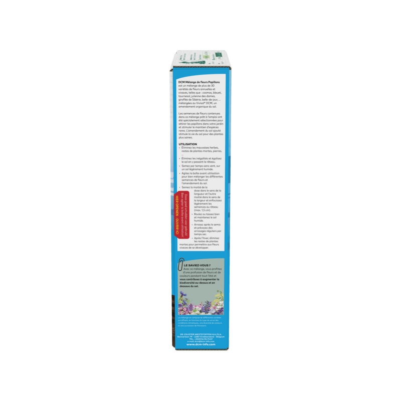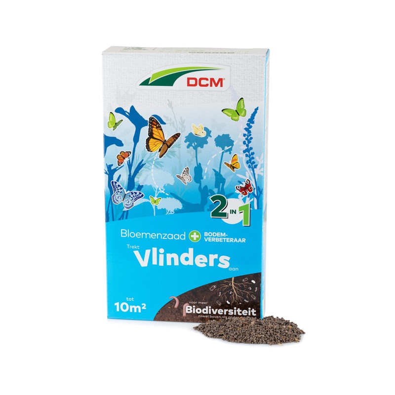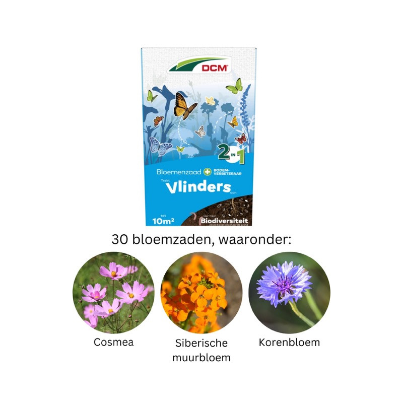 DCM Bloemenmengsel Vlinders bevat meer dan 30 bloemenzaden, zoals de Cosmea, Korenbloem en de Siberische muurbloem. Het mengsel trekt vlinders aan om zeldzame soorten te behouden.