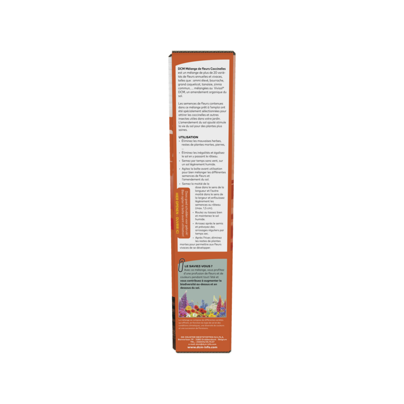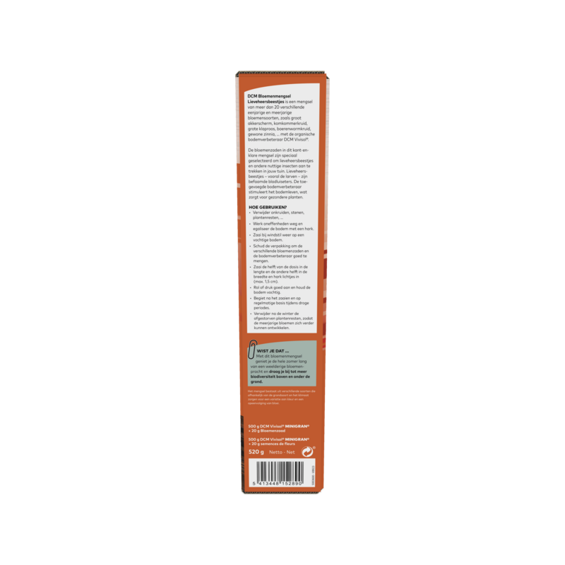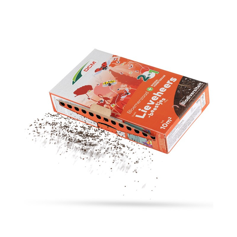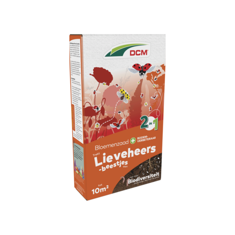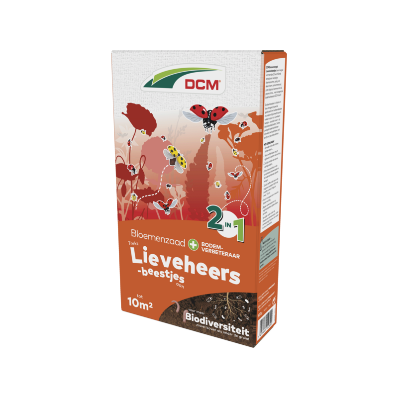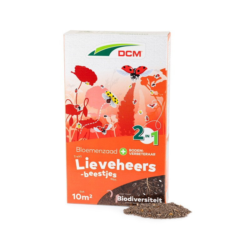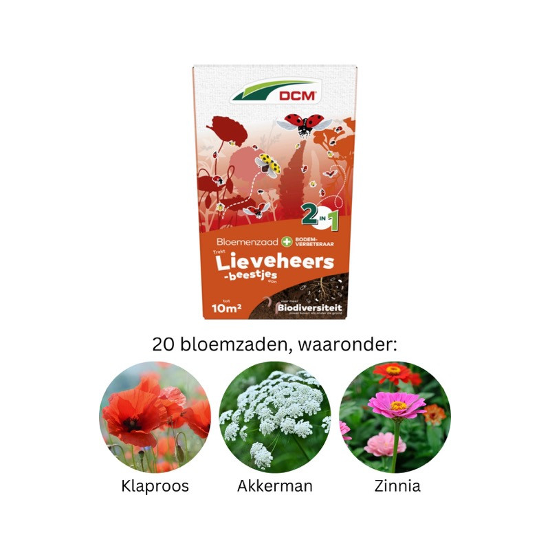 DCM Bloemenmengsel Lieveheersbeestjes bevat meer dan 20 bloemenzaden zoals groot akkerscherm, klaproos en de gewone zinnia. Het mengsel trekt deze lieveheersbeestjes aan om bladluizen te bestrijden. Een volwassen lieveheersbeestje eet gemiddeld 80 bladluizen per dag!