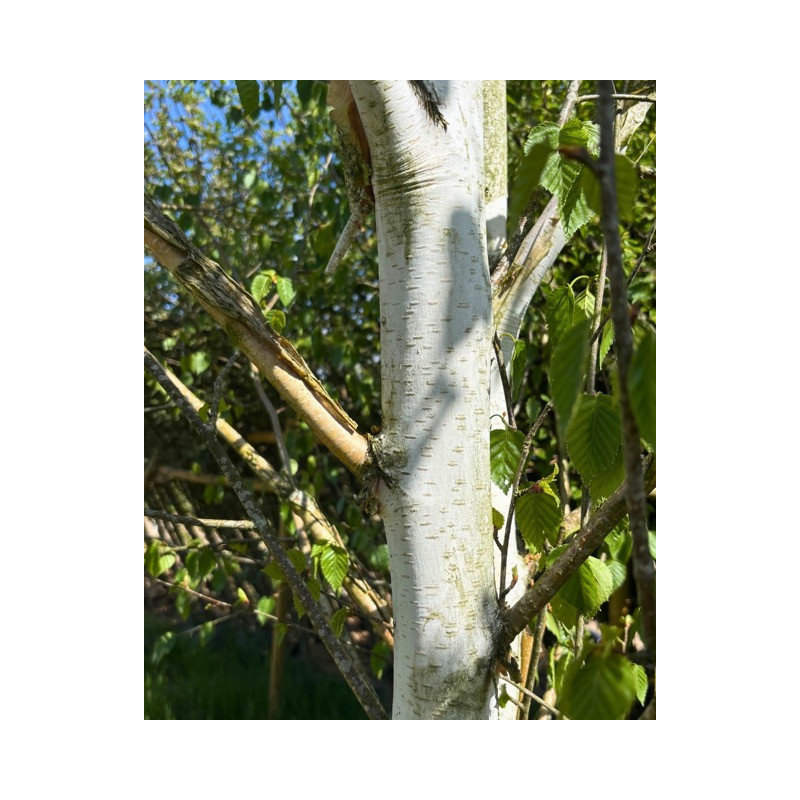 Maar het is de winter waarin deze berk echt uitblinkt: de helderwitte bast licht op tegen de kale achtergrond en schilfert hier en daar subtiel af. Dat geeft de boom niet alleen extra karakter, maar ook een bijna schilderachtige uitstraling.