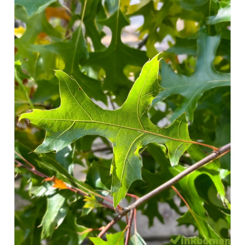• Diepgroene bladeren: De bladeren van de moeraseik zijn diep groen en gelobd van vorm, vergelijkbaar met die van andere eikensoorten. In de herfst veranderen de bladeren vaak in prachtige tinten rood, oranje en bruin voordat ze afvallen.