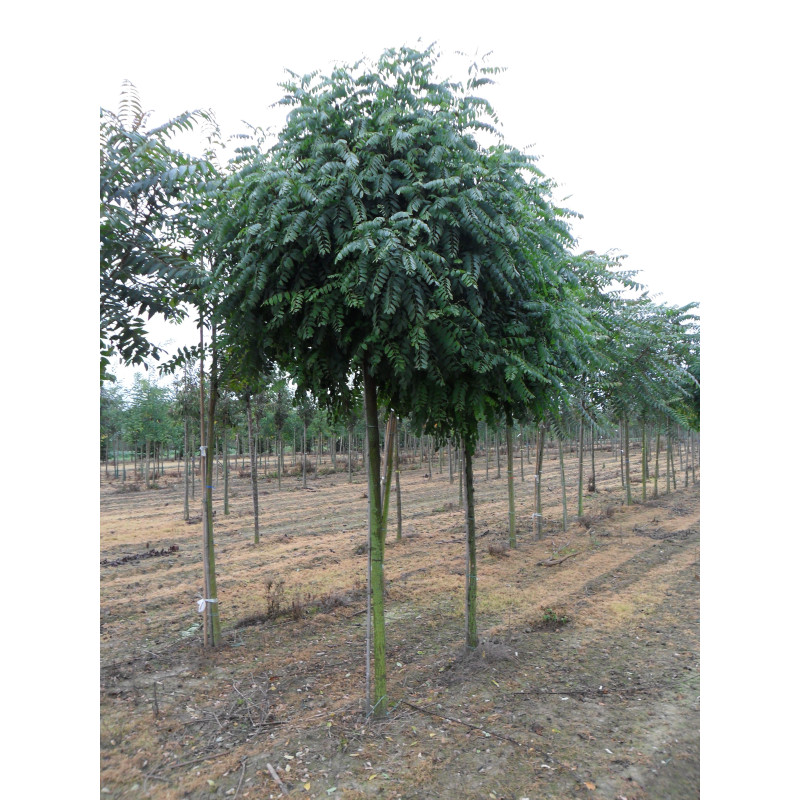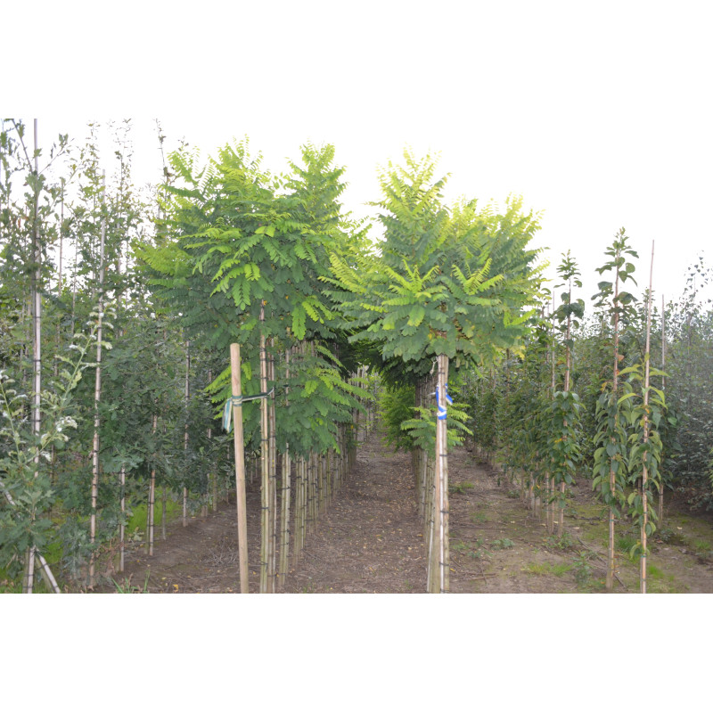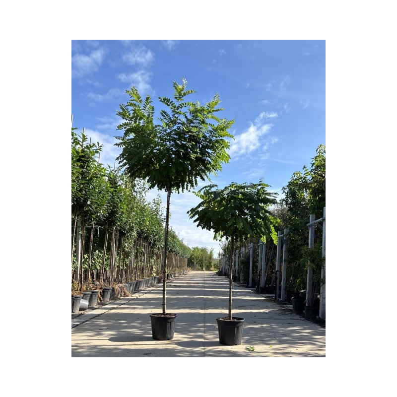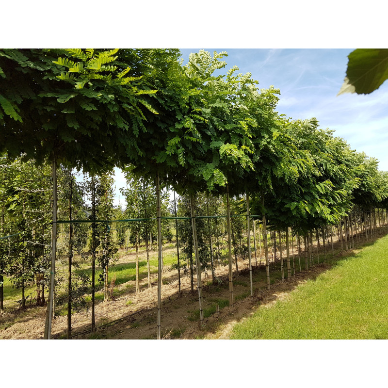 De Robinia ps. Umbraculifera word altijd geënt op een onderstam op onze kwekerij. Zo vormt op de gewenste hoogte een mooie bol. De Robinia ps. Umbraculifera heeft geen doorntjes. De bolacacia loopt pas laat uit, maar het behoudt dan ook langer zijn blad in de herfst. De bloei is afwezig wanneer de boom elk jaar gesnoeid wordt.