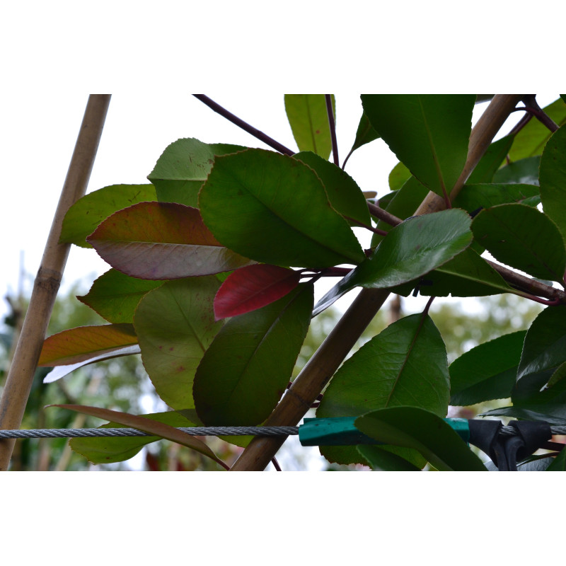 De glansmispel leiboom valt op door zijn jonge, roodkleurige scheuten — een prachtig contrast met het glanzende groene blad. Groenblijvend en het hele jaar door mooi in vorm. Groeit krachtig en eenvoudig te snoeien. Een leiboom met kleur én karakter.