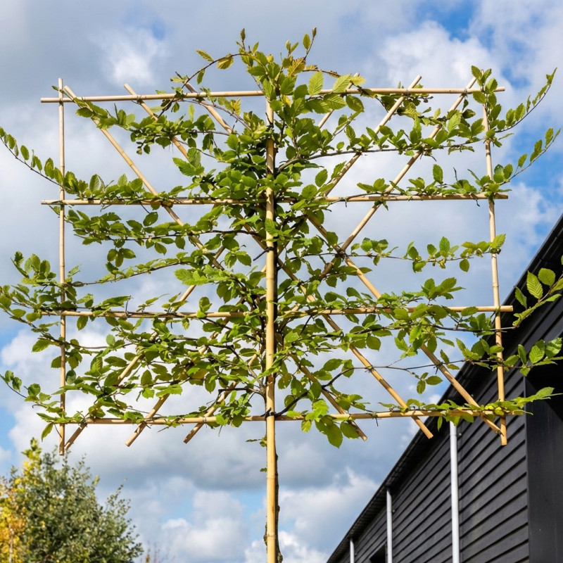 De Carpinus betulus is de haagbeuk. Door snoei en geleiding groeit deze soort in een plat leischerm.