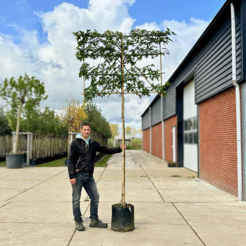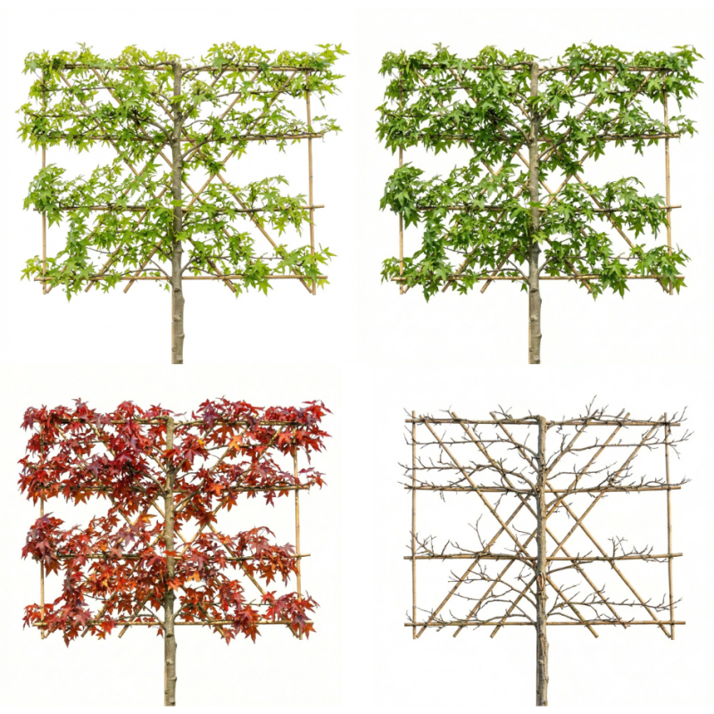 De liquidambar leiboom heeft een elegante en aantrekkelijke vorm, vooral wanneer hij wordt geleid in de leivorm. De takken groeien horizontaal en vormen een gelijkmatig verdeelde kroon, wat resulteert in een gestileerde uitstraling die zowel eigentijds als klassiek kan zijn. Deze kenmerkende vorm maakt de boom tot een geweldige keuze voor landschapsarchitectuur, waarbij hij een gevoel van orde en symmetrie brengt.